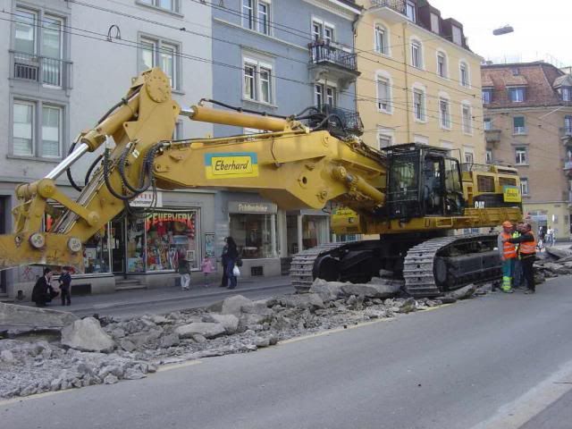 TomG wrote:Cat924Gz wrote:DPD1 wrote:OK, I know that road breaker one can't possibly be in the US, because there would be lawyers fainting in the street from of the lawsuit possibilities, after they saw zero barricades and/or signage to speak of. Defiantly not in the States, I believe from memory it's in, I want to say Holland, maybe Belgium. The machine carries a special bucket made for taking up old rail lines, hopefully one of the members from across the pond has a better memory than I and can provide a link. I believe it was in Germany. It was recently talked about on another forum. They were using the 385 to rip up old street car tracks. The special boom was to stay under the wires over the street. The special bucket had no back so the operator could pry up the track and slide it through the bucket and break a piece of the track off. Here are some more pictures of it. http://www.eberhard.ch/content.php?p...ude=praxis_gal And a video of it is at the bottom of this page, look for the claw ripping through pavement. http://www.eberhardfilmpool.ch/ Wow that video is brilliant, and also the other videos there are really good aswell, thanks for the link!