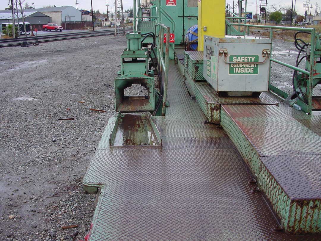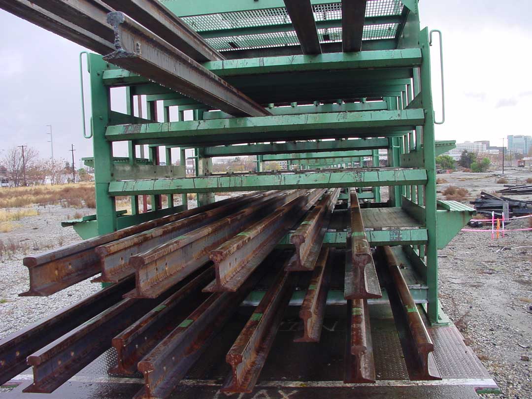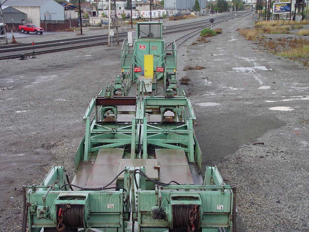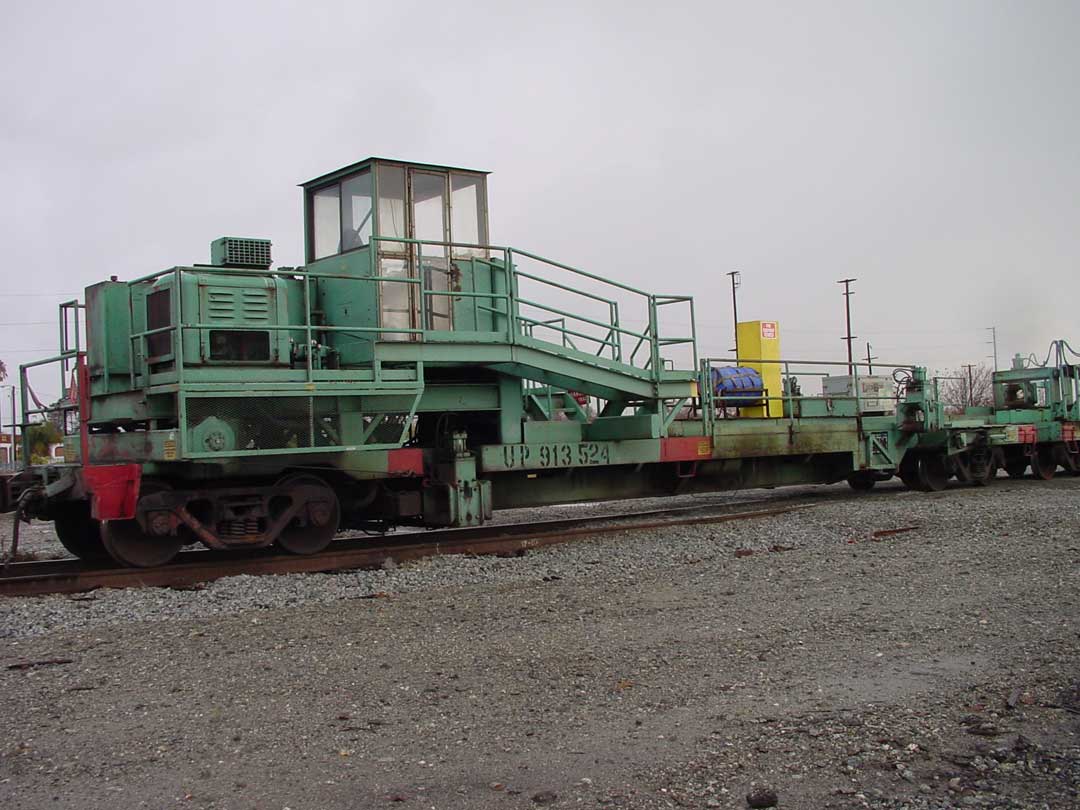 Love the MoW shots! Yes, the green rig is for laying continuous welded rail. There are multiple 40' or 50' long flat cars that are used to carry 1/4 mile long section of the continuous welded rail. This car, along with other ones are used to unload the 1/4 sections. This is accomplished by hydraulicly driven wheels that pull the sections off, and as the train moves at the same speed in the opposite direction, the track is lowered to the ground. When it comes to roads, the train stops, the rail is cut and the process starts again on the other side. The rail is first pulled off the carrying car with a cable, and then to the wheels, and then onto the ground. Below are some photos of these cars, not the best shots, multiple showers came through when I was taking these shots, back in 2004, in Santa Clara, CA.    Here are two shots of how the rail is stored on the rack cars  I like this shot, it shows how the rail just bends as needed!