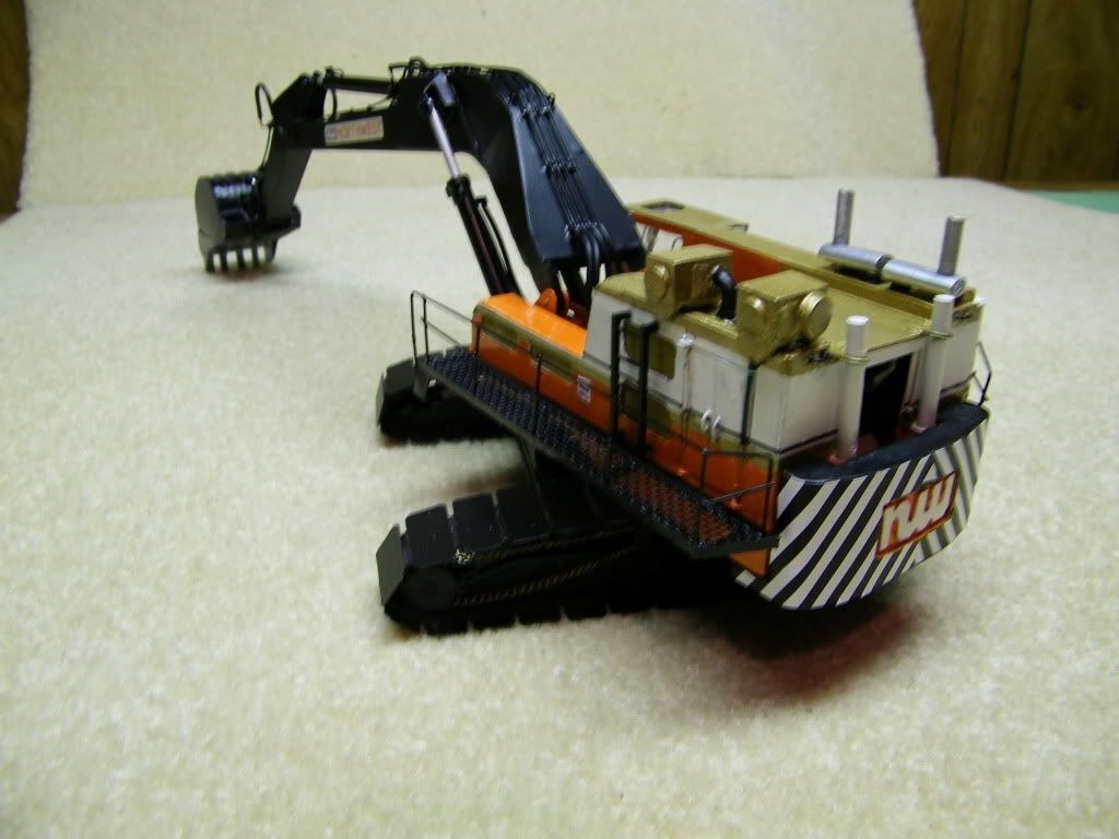 I have asked Randy to post the following pictures of a model I have been working on for the last few years or so. It is one of the last “NEW” machines the Northwest Engineering Co. built, and I think there were only a half dozen built. It was the NW 100DH Hydraulic Excavator, featuring an 860 HP Detroit Diesel 16V92T engine, 8 ¼ heaped cubic yard bucket, and weighted in at 237,000 Lbs. After obtaining catalogs and spec. sheets from a good friend, I was able to draw up the 1/50th scale plans to build this model. In the first picture, you can see the model can be completely stripped down for moving, and in this case, weighs in just over 51 US tons. It is shown on my 75 ton Talbert beam trailer, pulled by a DK64A Autocar tractor. The rest of the pictures show the model in various positions. The doors and hatch covers open to show off the complete interior, showing engine, pumps and piping. The tracks are movable, and the complete model was scratch built, except the ball bearing I used for the turntable. I build to 1/50th scale to go with all my other scratch and Diecast model collection. I hope you enjoyed seeing this model, as I always enjoying seeing everyone else’s. Daniel D
