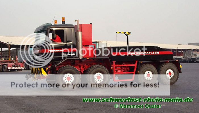 Chip Carlin wrote:...What a fantastic job......like those tires !....Where's da Beef...... I've been wondering myself if it is still in service out there in Quatar. Sounds like it's been built back in 2006, acording to Joe's previous link. Can anyone from Mammoet who has access to their intranet or something let us know? May I push my luck even more and ask for supplemental pictures or videos than those found on Google when typing "Mammoet-titan-quatar-actros". Or maybe they're using different words in Nederlandese or German, I don't know. Thanks, S.