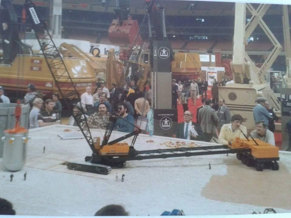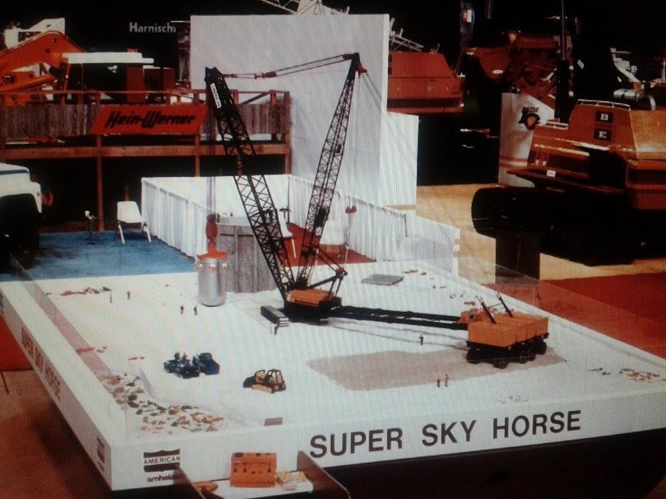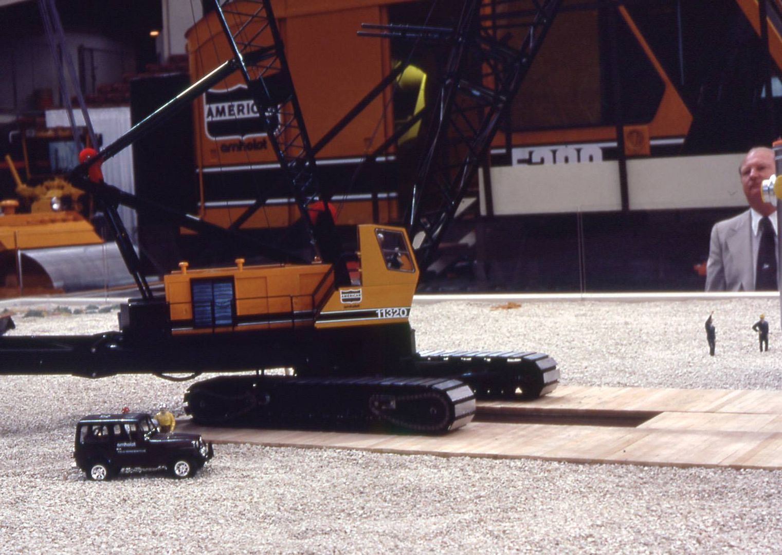 Photos courtesy of Johnny Van Der Zee.These are photos he provided of the 1:16 working model of the American 11320 Super Sky Horse. This model was one of the ones displayed by American at shows in the 1980's.    He notes that it was powered by 8 110 Volt Electric Motors. It has 4 travel motors, 1 swing motor, 2 winch drum motors, and 1 motor to turn the wheels on the weight tray. Also, some photos he provided of the 11320 at the American stand at Conexpo 85'